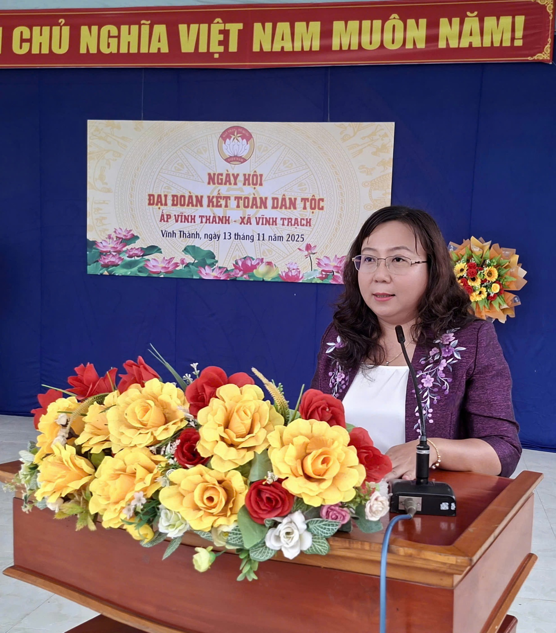 Phát biểu tại ngày hội, bà Nguyễn Thị Tuyết Minh – Bí thư Đảng ủy, Chủ tịch HĐND xã ghi nhận và biểu dương những kết quả nổi bật mà ấp Vĩnh Thành đạt được, đồng thời đề nghị Ban vận động ấp Vĩnh Thành tiếp tục phát huy truyền thống đoàn kết, thực hiện tốt các chủ trương của Đảng, chính sách pháp luật của Nhà nước, tích cực tham gia các phong trào thi đua yêu nước, góp phần xây dựng xã Vĩnh Trạch ngày càng giàu đẹp, văn minh, nghĩa tình.