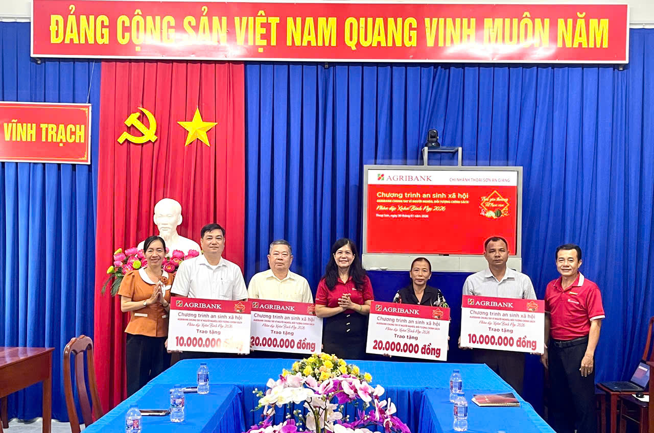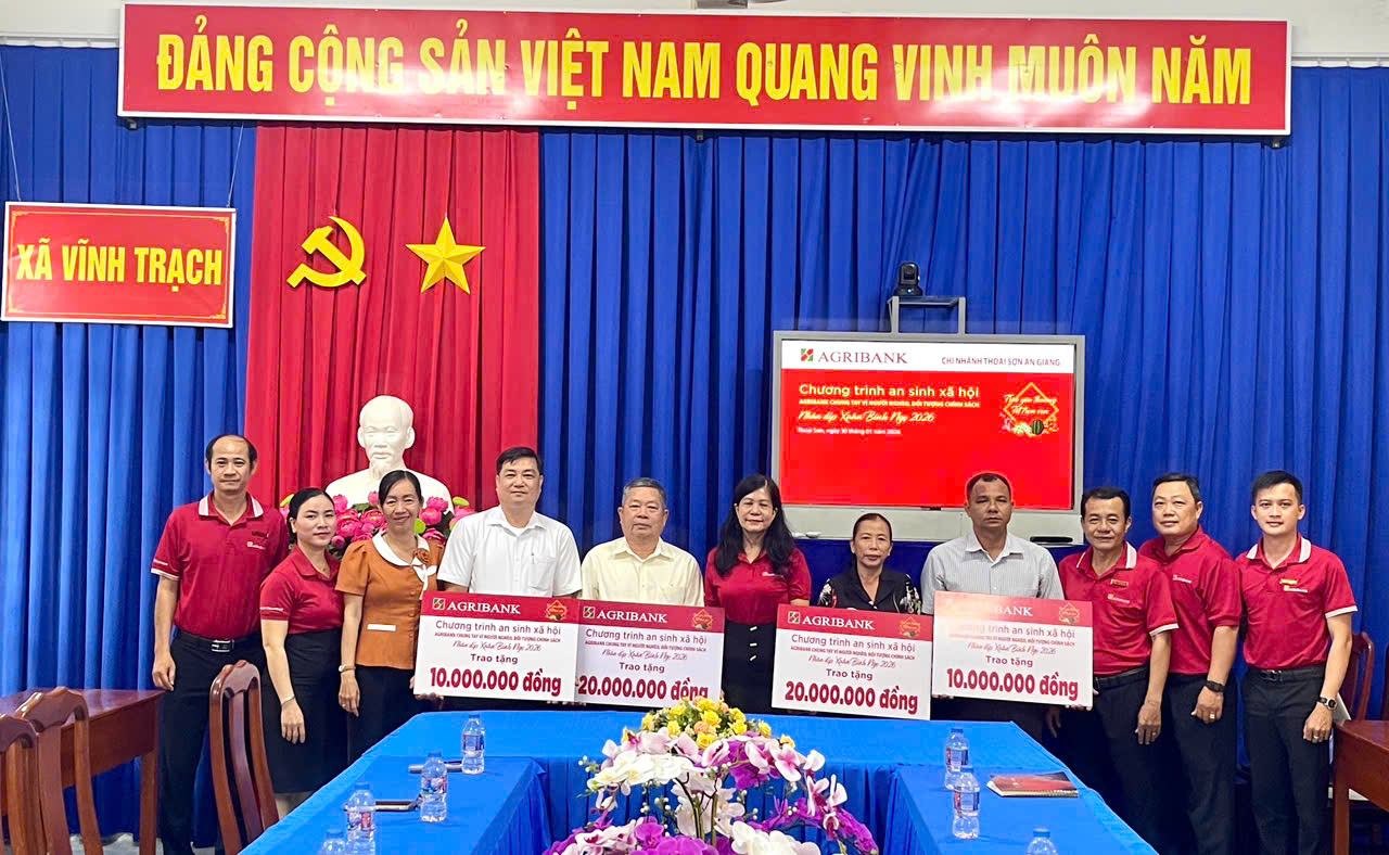 Tại chương trình, Agribank Chi nhánh Thoại Sơn đã trao kinh phí thực hiện chương trình an sinh xã hội nhân dịp Xuân Bính Ngọ 2026 cho 04 xã, với tổng số tiền 60 triệu đồng. Trong đó, xã Vĩnh Trạch được hỗ trợ 20 triệu đồng; xã Thoại Sơn 20 triệu đồng; xã Phú Hòa 10 triệu đồng và xã Định Mỹ 10 triệu đồng. Nguồn kinh phí trên sẽ được các cấp ủy, chính quyền, Mặt trận Tổ quốc và các tổ chức đoàn thể phối hợp tổ chức trao hỗ trợ đúng đối tượng, bảo đảm thiết thực, hiệu quả.