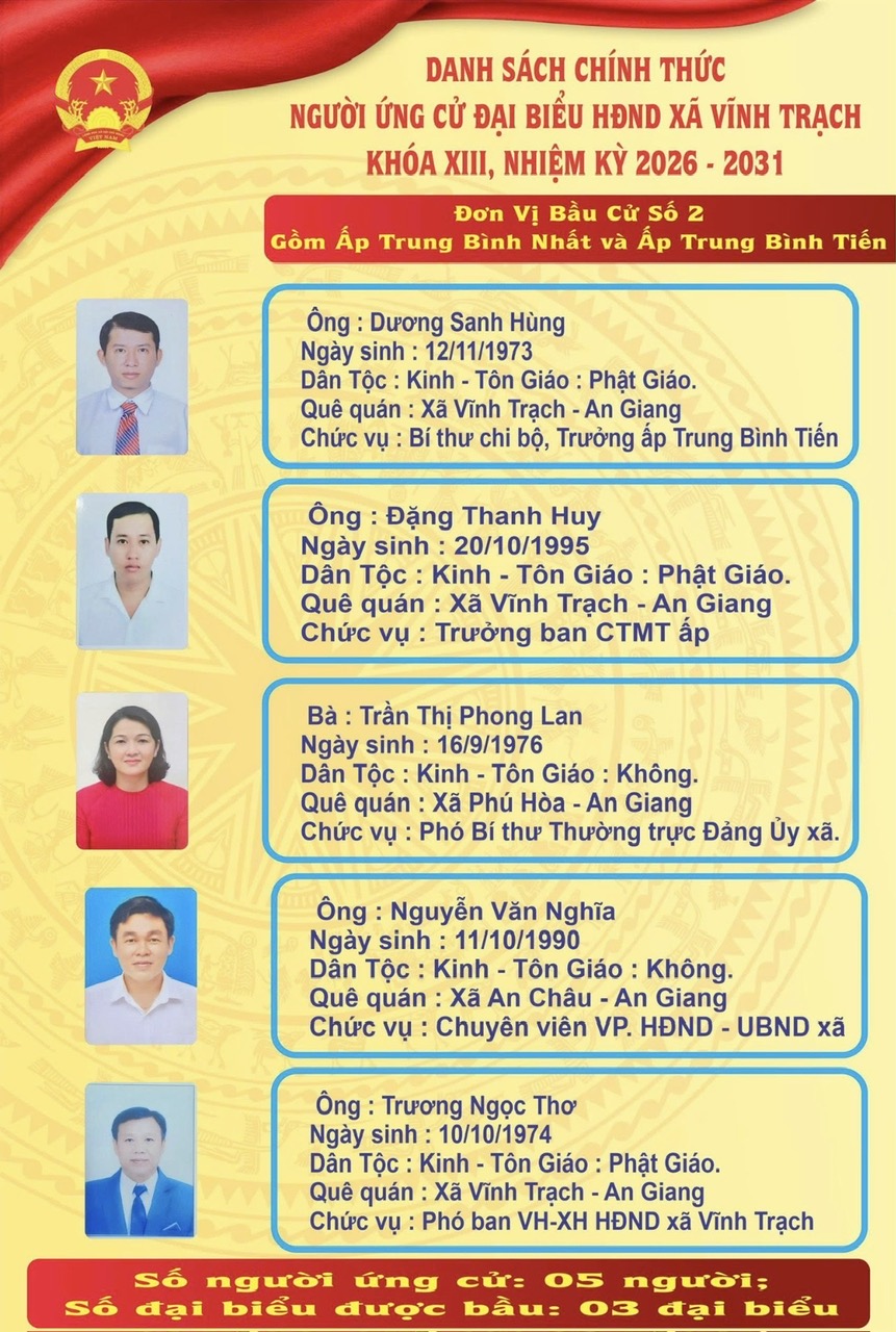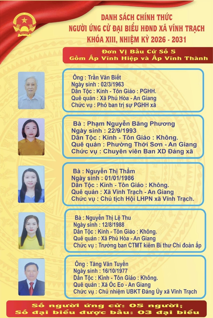 DANH SÁCH CHÍNH THỨC NGƯỜI ỨNG CỬ ĐẠI BIỂU HĐND XÃ VĨNH TRẠCH KHÓA XIII, NHIỆM KỲ 2026-2031. ĐƠN VỊ BẦU CỬ SỐ 5 (GỒM ẤP VĨNH HIỆP VÀ ẤP VĨNH THÀNH)