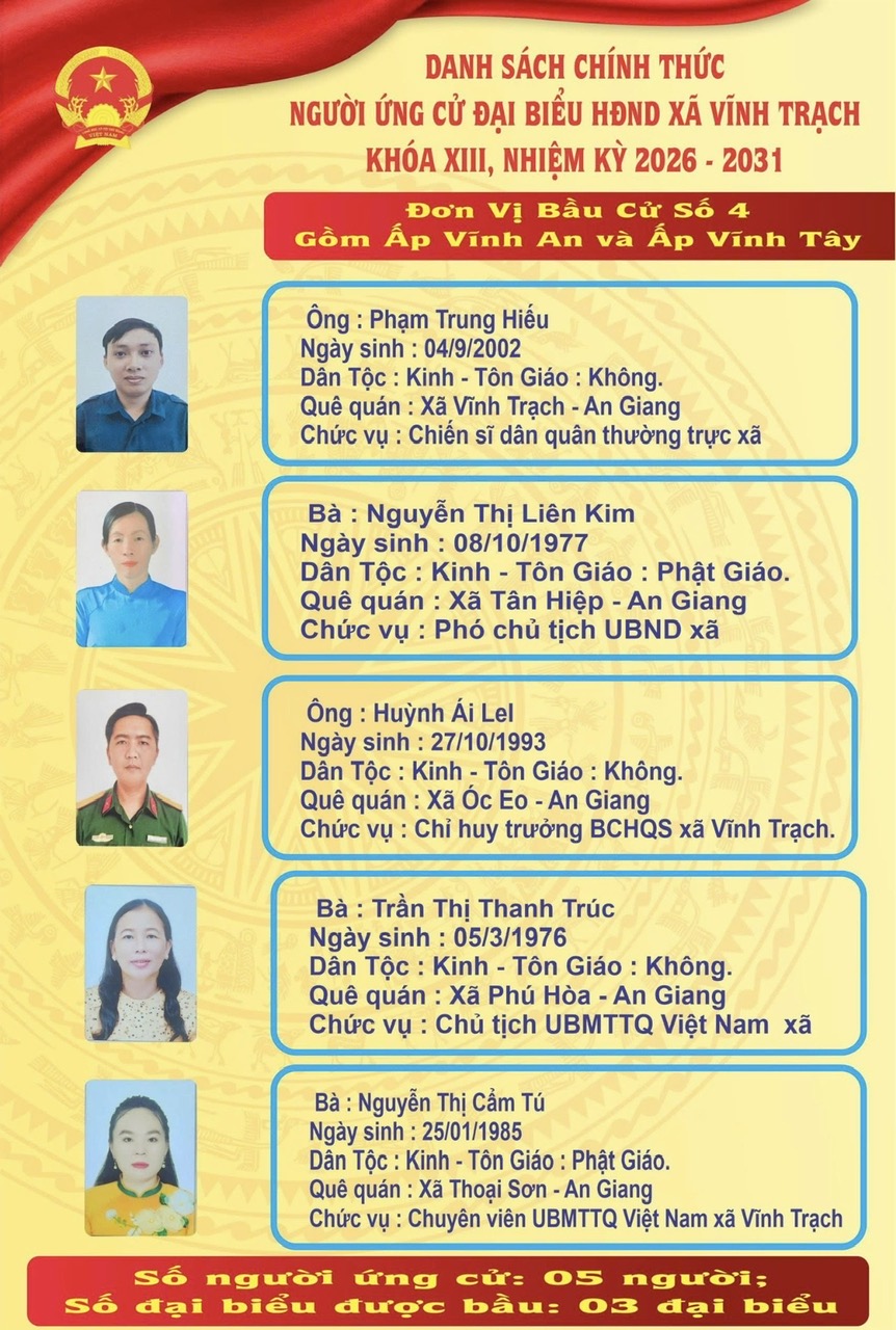 DANH SÁCH CHÍNH THỨC NGƯỜI ỨNG CỬ ĐẠI BIỂU HĐND XÃ VĨNH TRẠCH KHÓA XIII, NHIỆM KỲ 2026-2031. ĐƠN VỊ BẦU CỬ SỐ 4 (GỒM ẤP VĨNH AN VÀ ẤP VĨNH TÂY)