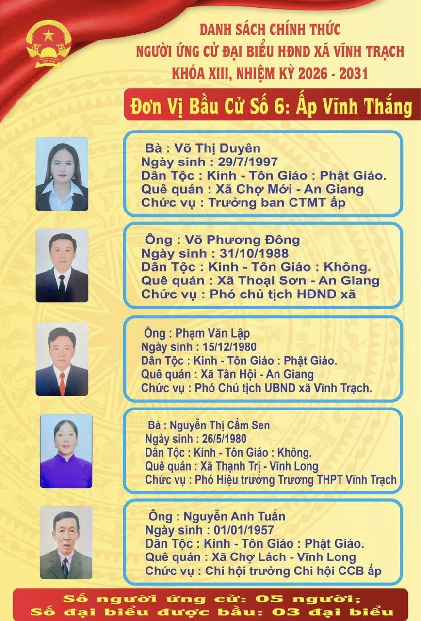 DANH SÁCH CHÍNH THỨC NGƯỜI ỨNG CỬ ĐẠI BIỂU HĐND XÃ VĨNH TRẠCH KHÓA XIII, NHIỆM KỲ 2026-2031. ĐƠN VỊ BẦU CỬ SỐ 6 (GỒM ẤP VĨNH THẮNG)