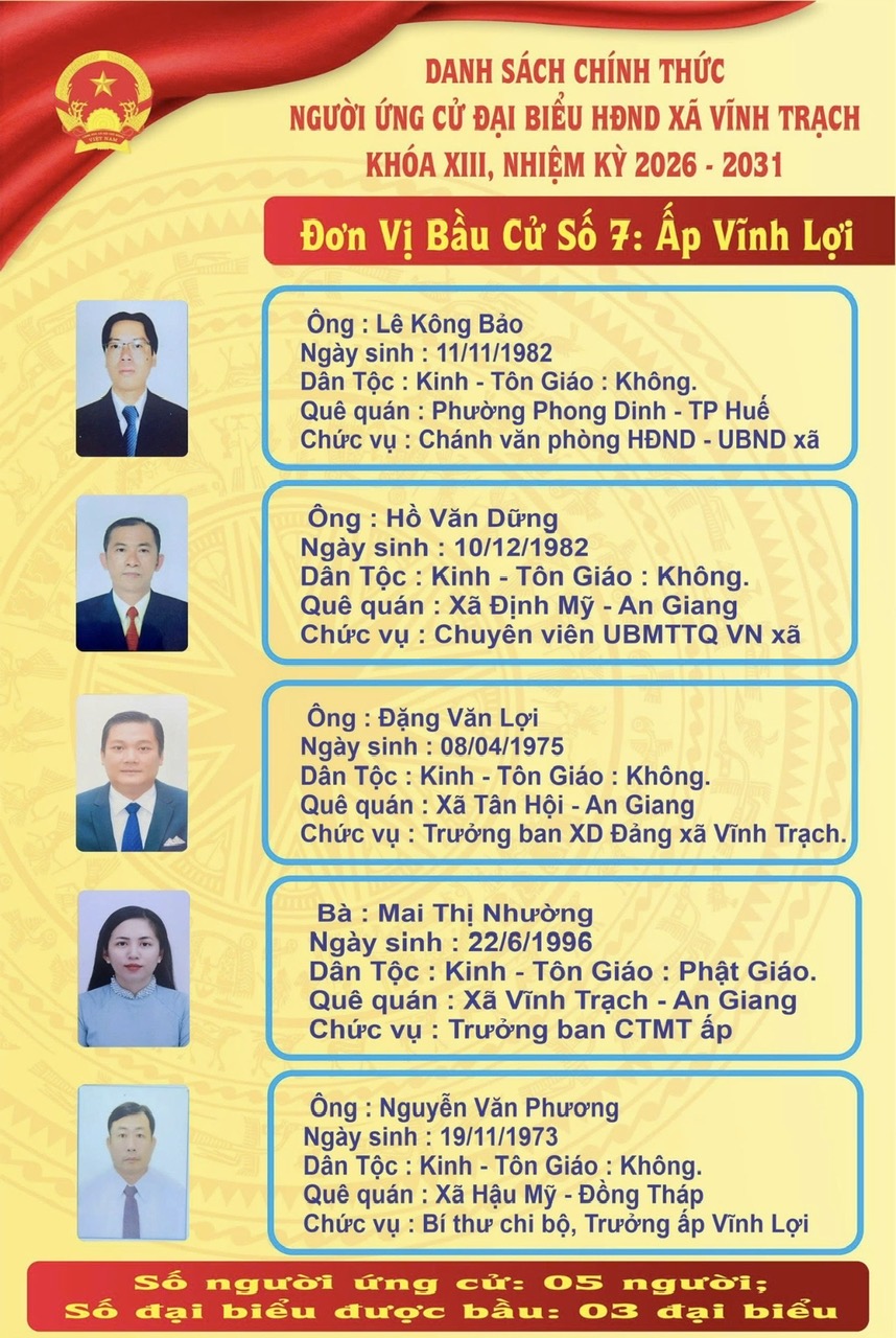 DANH SÁCH CHÍNH THỨC NGƯỜI ỨNG CỬ ĐẠI BIỂU HĐND XÃ VĨNH TRẠCH KHÓA XIII, NHIỆM KỲ 2026-2031. ĐƠN VỊ BẦU CỬ SỐ 7 (GỒM ẤP VĨNH LỢI)