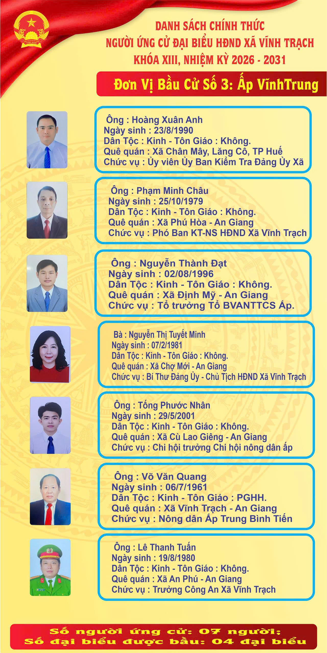 DANH SÁCH CHÍNH THỨC NGƯỜI ỨNG CỬ ĐẠI BIỂU HĐND XÃ VĨNH TRẠCH KHÓA XIII, NHIỆM KỲ 2026-2031. ĐƠN VỊ BẦU CỬ SỐ 3 (GỒM ẤP VĨNH TRUNG)