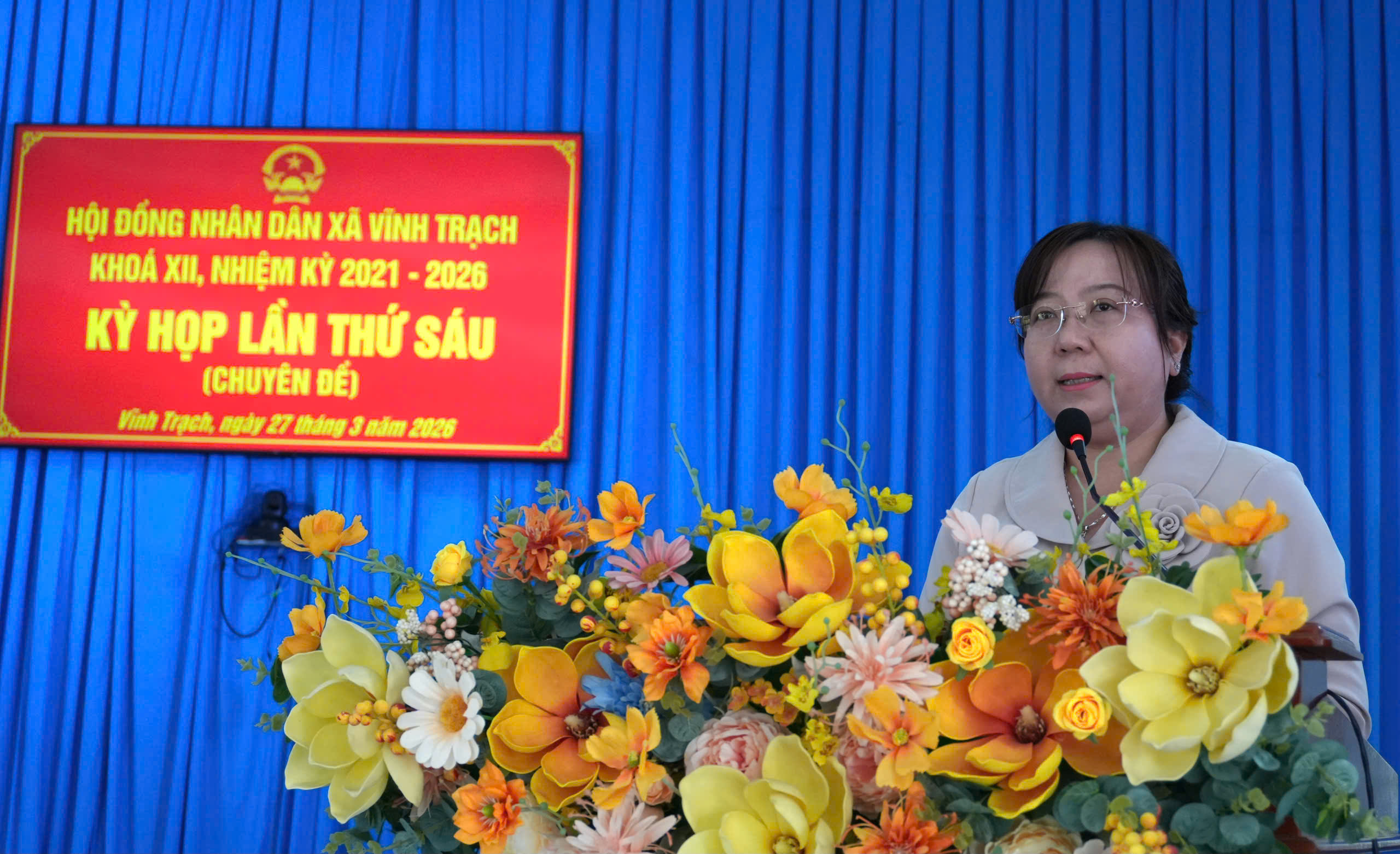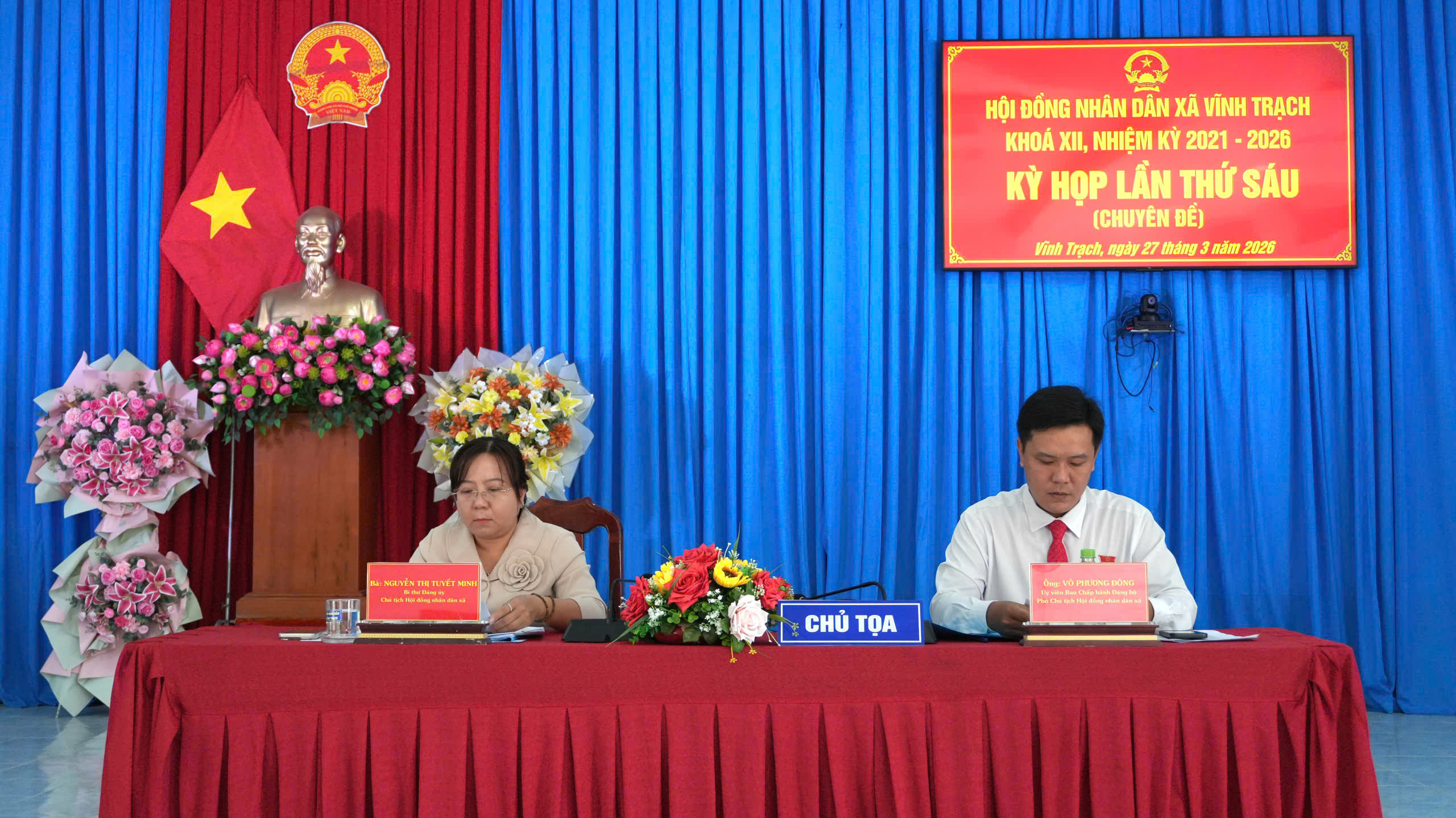Sáng ngày 27/3/2026, Hội đồng nhân dân xã Vĩnh Trạch khóa XII, nhiệm kỳ 2021–2026 tổ chức Kỳ họp lần thứ sáu (chuyên đề). Bà Nguyễn Thị Tuyết Minh – Bí thư Đảng ủy, Chủ tịch Hội đồng nhân dân xã và ông Võ Phương Đông – Uỷ viên Ban Chấp hành Đảng bộ, Phó Chủ tịch Hội đồng nhân dân xã chủ tọa Kỳ họp. Tham dự kỳ họp có bà Trần Thị Phong Lan – Phó Bí thư Thường trực Đảng ủy xã; ông Nguyễn Thiện Bảo – Phó Bí thư Đảng ủy, Chủ tịch Uỷ ban nhân dân xã cùng các đại biểu Hội đồng nhân dân xã khóa XII; lãnh đạo các ban, ngành, đoàn thể và Ban nhân dân các ấp trên địa bàn xã.