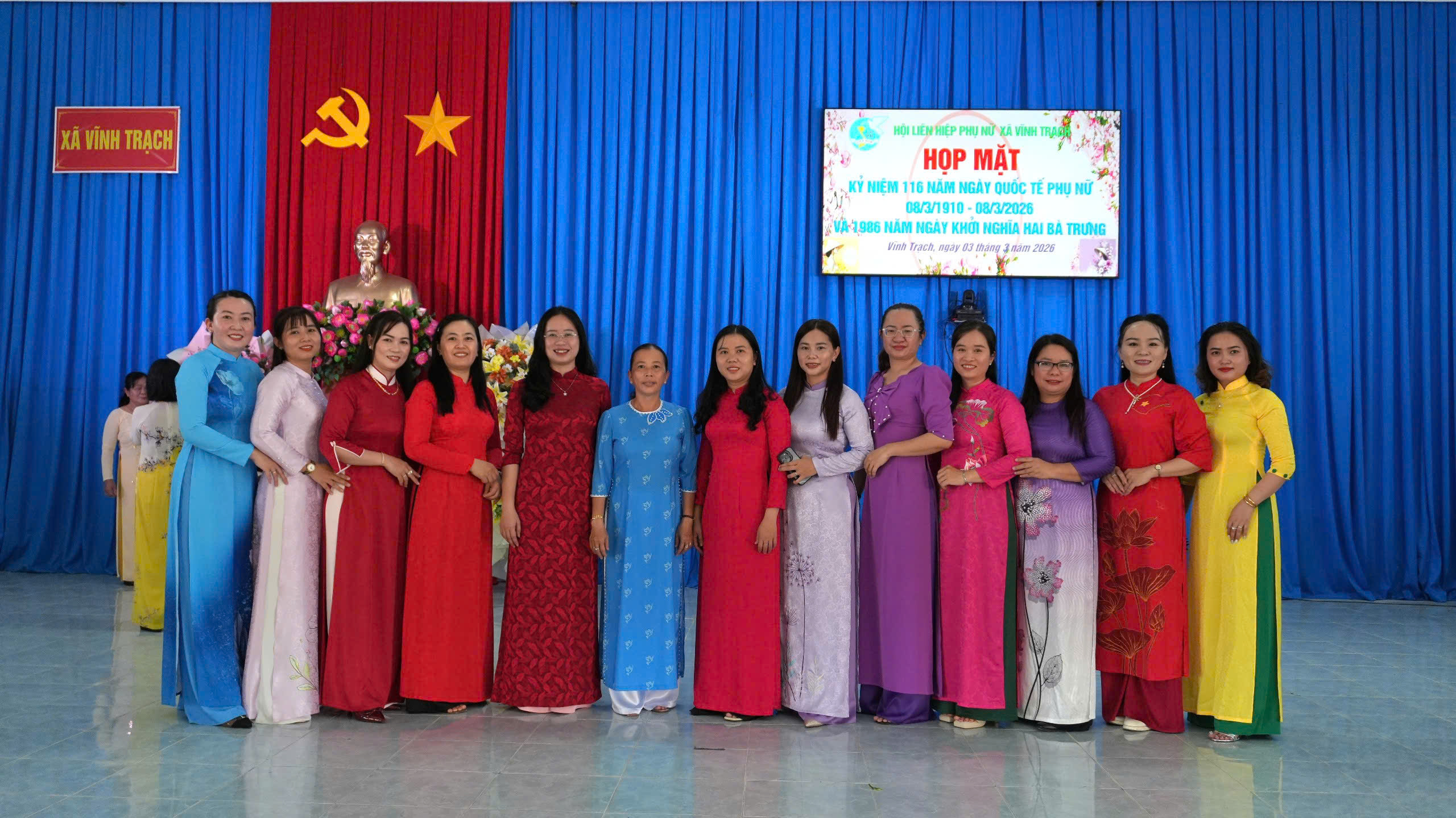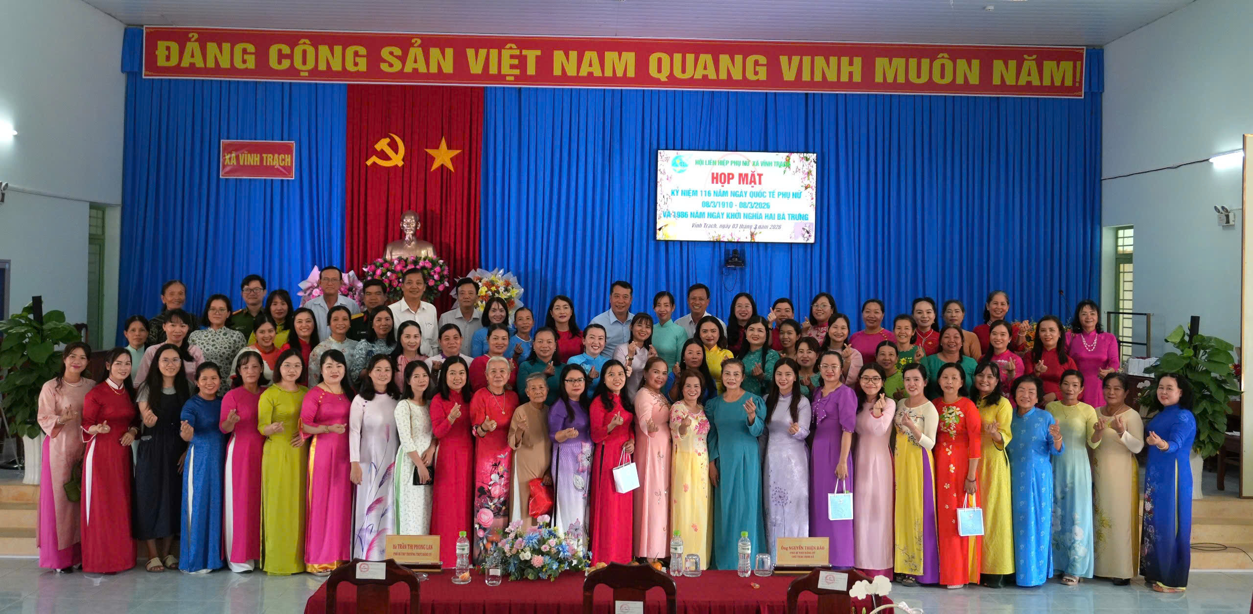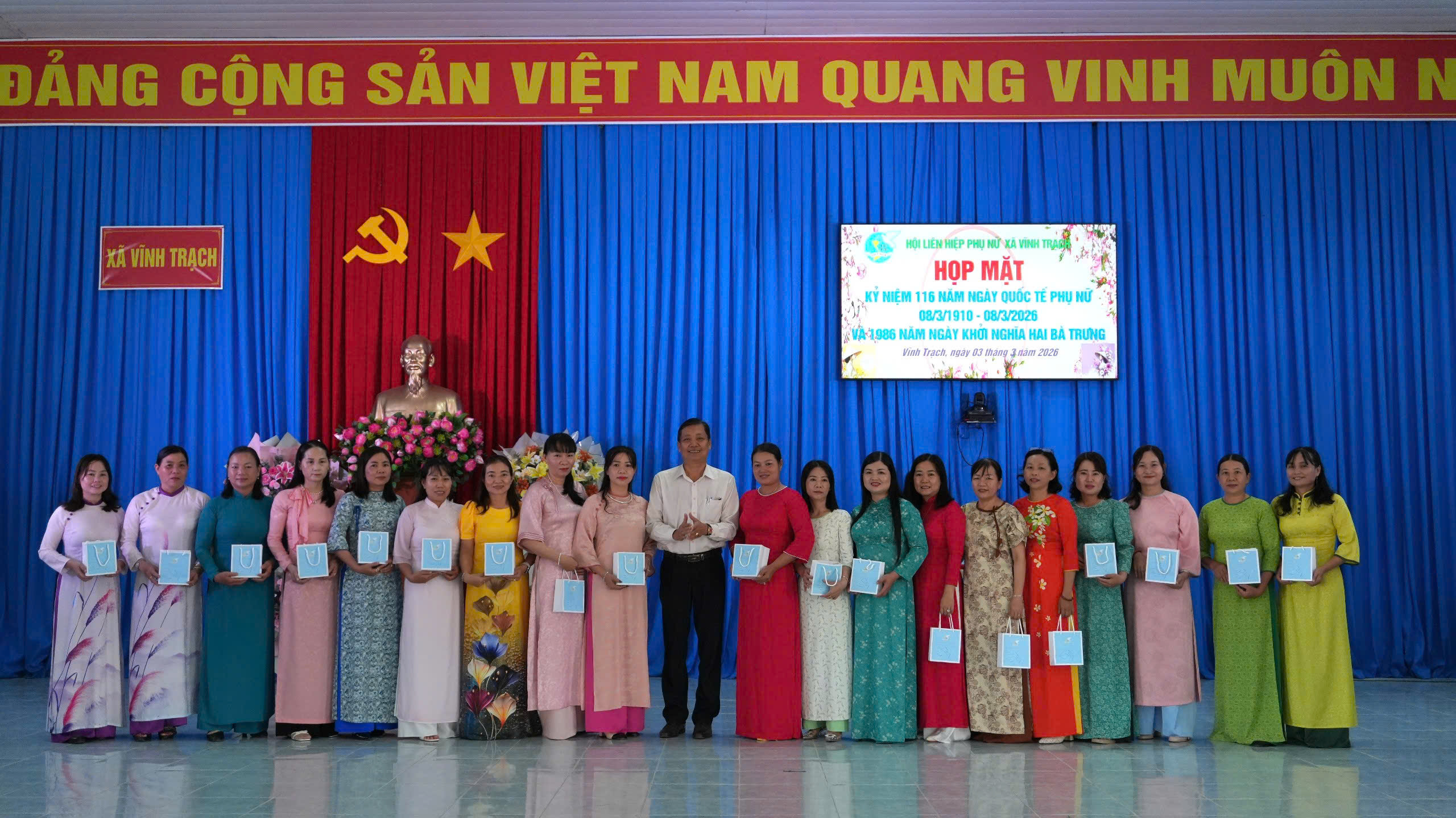 Sáng ngày 03/3/2026, Hội Liên hiệp Phụ nữ xã Vĩnh Trạch tổ chức họp mặt kỷ niệm 116 năm Ngày Quốc tế Phụ nữ (8/3/1910 – 8/3/2026) và 1986 năm Ngày Khởi nghĩa Hai Bà Trưng. Tham dự buổi họp mặt có bà Trần Thị Phong Lan – Phó Bí thư Thường trực Đảng ủy xã; ông Nguyễn Thiện Bảo – Phó Bí thư Đảng ủy, Chủ tịch UBND xã; ông Đặng Văn Lợi - Ủy viên Ban Thường vụ Đảng ủy, Trưởng Ban Xây dựng Đảng xã; ông Tăng Văn Tuyền - Ủy viên Ban Thường vụ Đảng ủy, Chủ nhiệm Uỷ ban Kiểm tra Đảng uỷ xã; ông Phạm Văn Lập – Ủy viên Ban Thường vụ Đảng ủy, Phó Chủ tịch UBND xã; bà Nguyễn Thị Liên Kim – Uỷ viên Ban Chấp hành Đảng bộ, Phó Chủ tịch UBND xã cùng trưởng các ban, ngành, đoàn thể xã và toàn thể cán bộ, hội viên phụ nữ trên địa bàn.