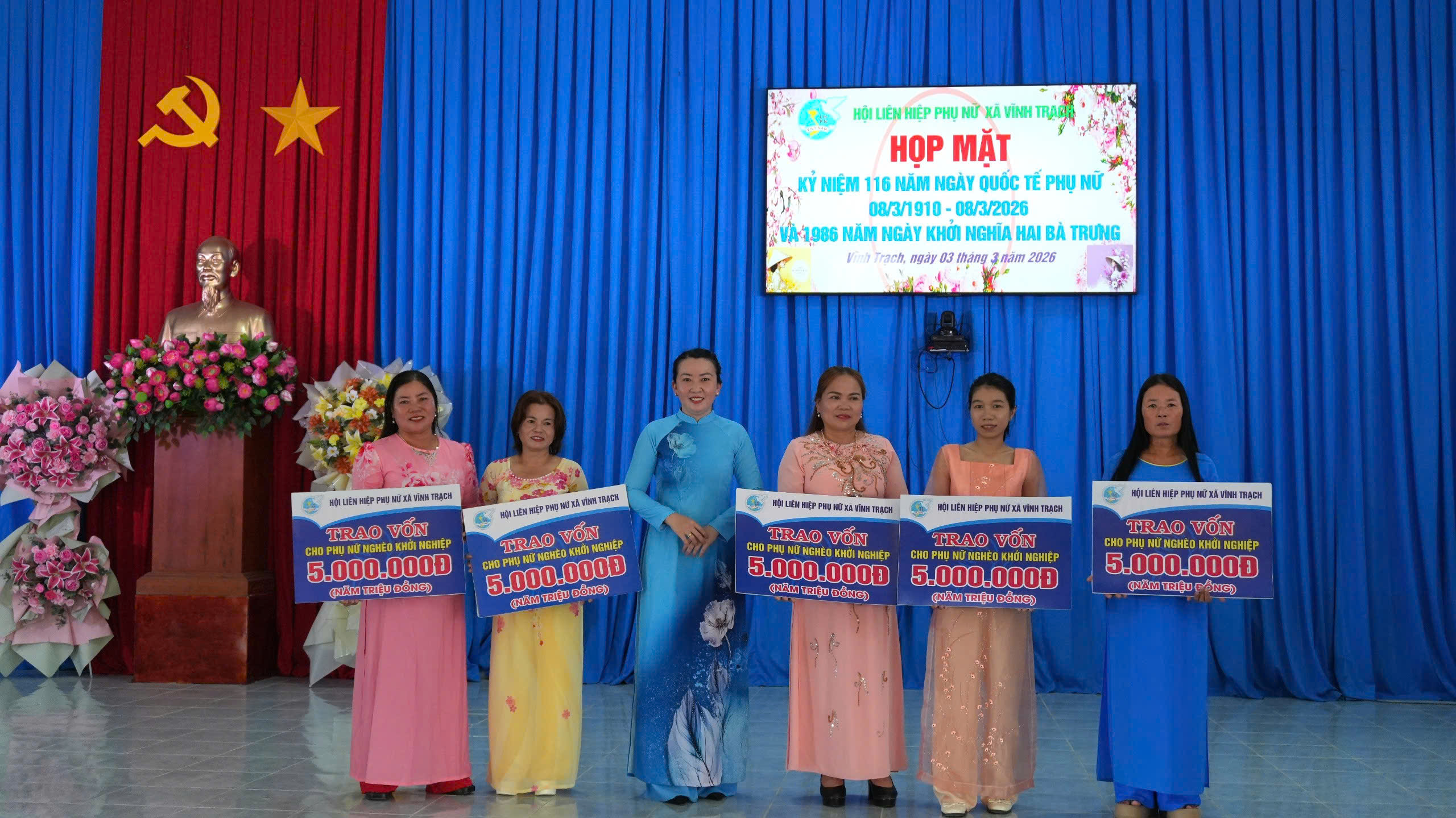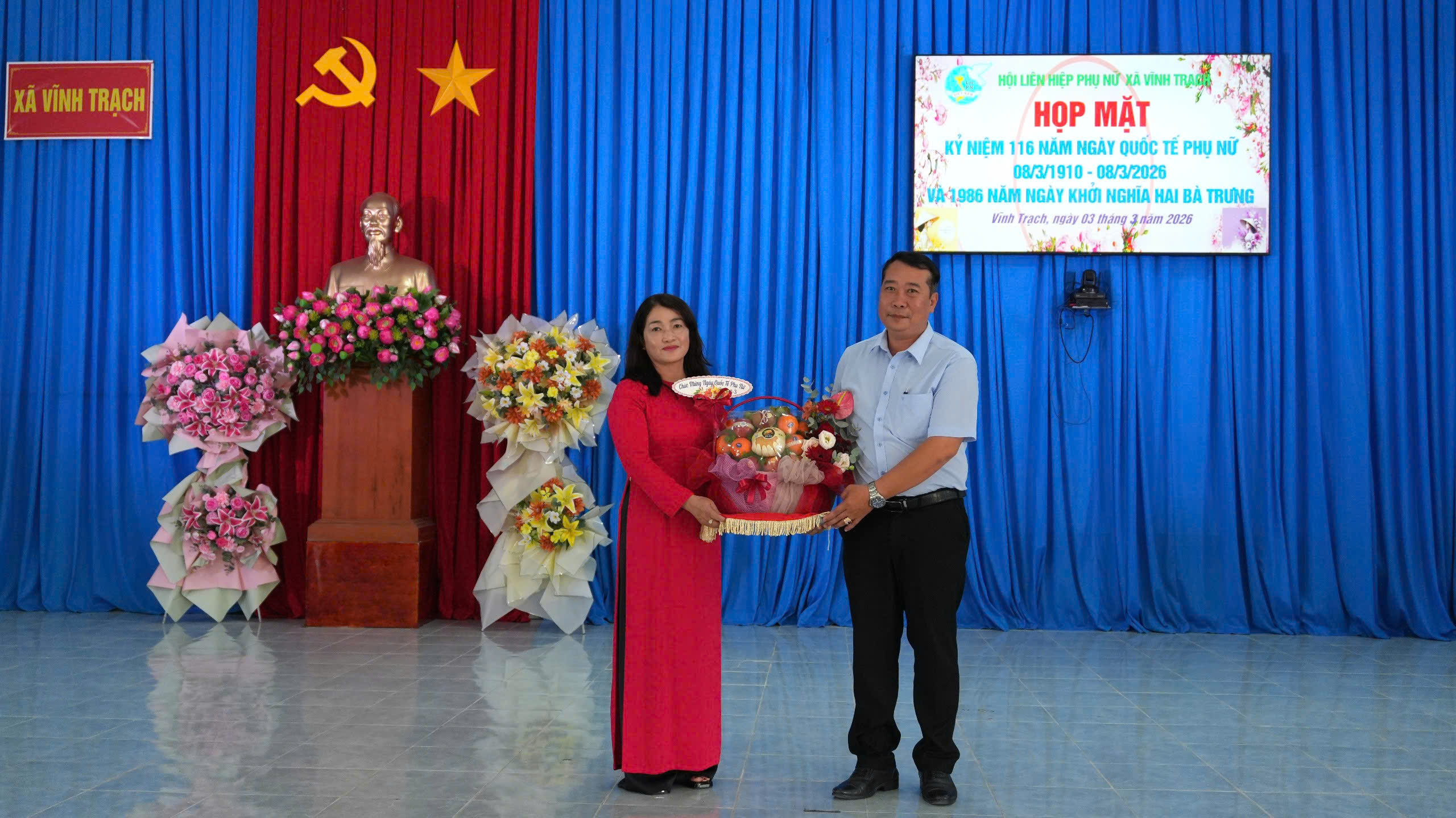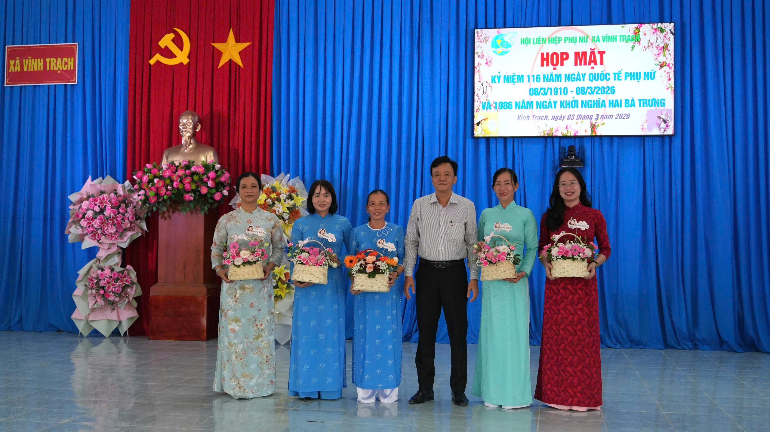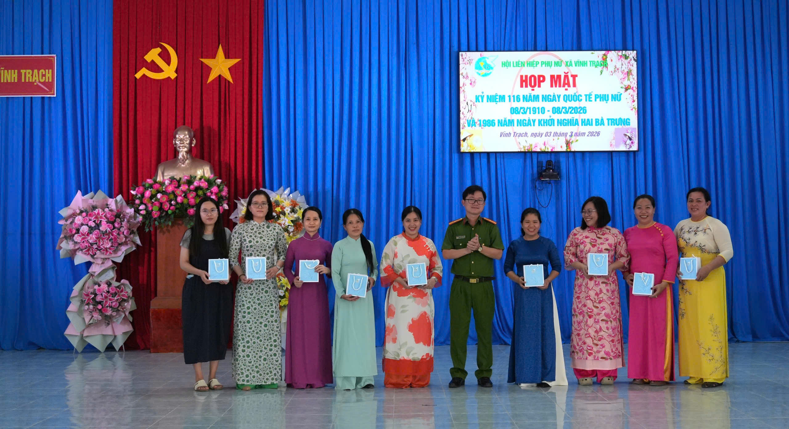 Sáng ngày 03/3/2026, Hội Liên hiệp Phụ nữ xã Vĩnh Trạch tổ chức họp mặt kỷ niệm 116 năm Ngày Quốc tế Phụ nữ (8/3/1910 – 8/3/2026) và 1986 năm Ngày Khởi nghĩa Hai Bà Trưng. Tham dự buổi họp mặt có bà Trần Thị Phong Lan – Phó Bí thư Thường trực Đảng ủy xã; ông Nguyễn Thiện Bảo – Phó Bí thư Đảng ủy, Chủ tịch UBND xã; ông Đặng Văn Lợi - Ủy viên Ban Thường vụ Đảng ủy, Trưởng Ban Xây dựng Đảng xã; ông Tăng Văn Tuyền - Ủy viên Ban Thường vụ Đảng ủy, Chủ nhiệm Uỷ ban Kiểm tra Đảng uỷ xã; ông Phạm Văn Lập – Ủy viên Ban Thường vụ Đảng ủy, Phó Chủ tịch UBND xã; bà Nguyễn Thị Liên Kim – Uỷ viên Ban Chấp hành Đảng bộ, Phó Chủ tịch UBND xã cùng trưởng các ban, ngành, đoàn thể xã và toàn thể cán bộ, hội viên phụ nữ trên địa bàn.