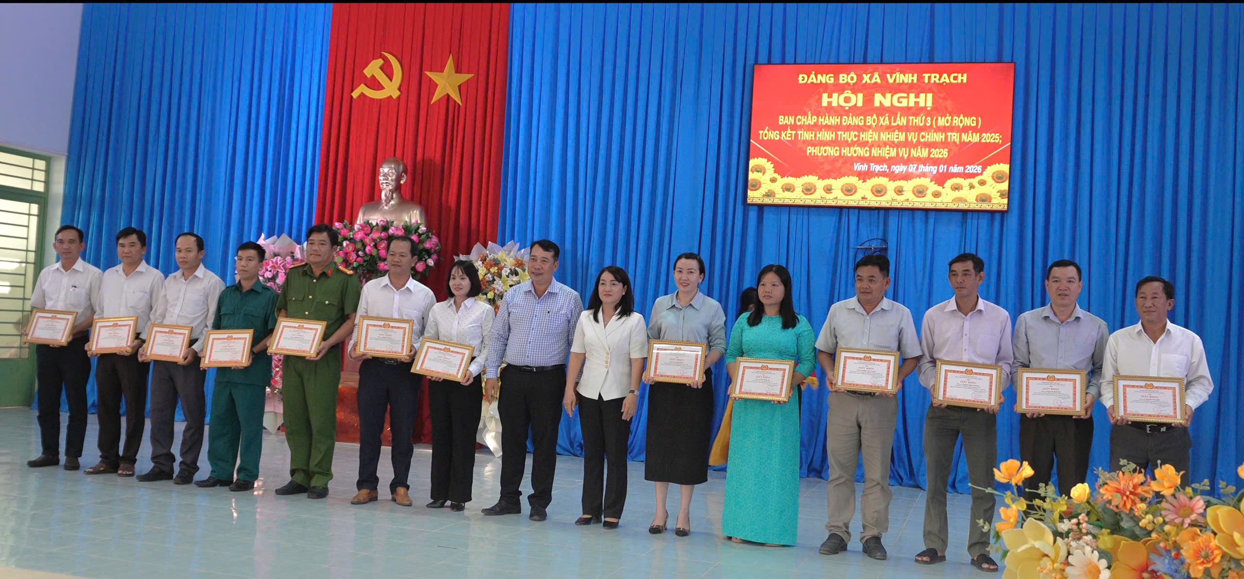 Năm 2025, Đảng bộ xã Vĩnh Trạch đã phát huy tinh thần đoàn kết, chủ động, sáng tạo, lãnh đạo thực hiện đạt nhiều kết quả nổi bật. Có 12 chỉ tiêu đạt và 8 chỉ tiêu vượt nghị quyết đề ra trong năm 2025.Nổi bật, tốc độ tăng trưởng kinh tế đạt 8,3%; thu nhập bình quân đầu người đạt 85 triệu đồng/năm. Sản xuất nông nghiệp tiếp tục giữ vai trò chủ lực với tổng diện tích gieo trồng trên 12.200 ha, sản lượng lương thực đạt trên 88.600 tấn; diện tích lúa liên kết bao tiêu sản phẩm đạt hơn 1.220 ha, vượt chỉ tiêu nghị quyết. Lĩnh vực thủy sản, chăn nuôi, thương mại – dịch vụ tiếp tục phát triển ổn định, giải quyết việc làm cho lao động địa phương. Hệ thống hạ tầng giao thông, điện, nước, chiếu sáng nông thôn được quan tâm đầu tư. Các lĩnh vực văn hóa – xã hội có nhiều chuyển biến tích cực; tỷ lệ hộ gia đình văn hóa đạt gần 99%; tỷ lệ hộ nghèo đa chiều giảm còn dưới 2%. Công tác cải cách hành chính, chuyển đổi số được đẩy mạnh; Quốc phòng – an ninh được giữ vững, trật tự an toàn xã hội ổn định.Trong công tác xây dựng Đảng, Đảng bộ xã đã phát triển mới 7 đảng viên, vượt chỉ tiêu nghị quyết; hoàn thành 100% chương trình kiểm tra, giám sát theo kế hoạch; hoạt động của Mặt trận Tổ quốc và các tổ chức chính trị – xã hội tiếp tục được đổi mới, góp phần củng cố khối đại đoàn kết toàn dân. Hội nghị cũng đã thông qua các nội dung quan trọng gồm: phương hướng, nhiệm vụ trọng tâm năm 2026; dự thảo Chương trình làm việc của Ban Chấp hành Đảng bộ, Ban Thường vụ Đảng ủy năm 2026; chỉ tiêu Nghị quyết năm 2026; chương trình công tác kiểm tra, giám sát và công tác phát triển đảng viên trong năm 2026.