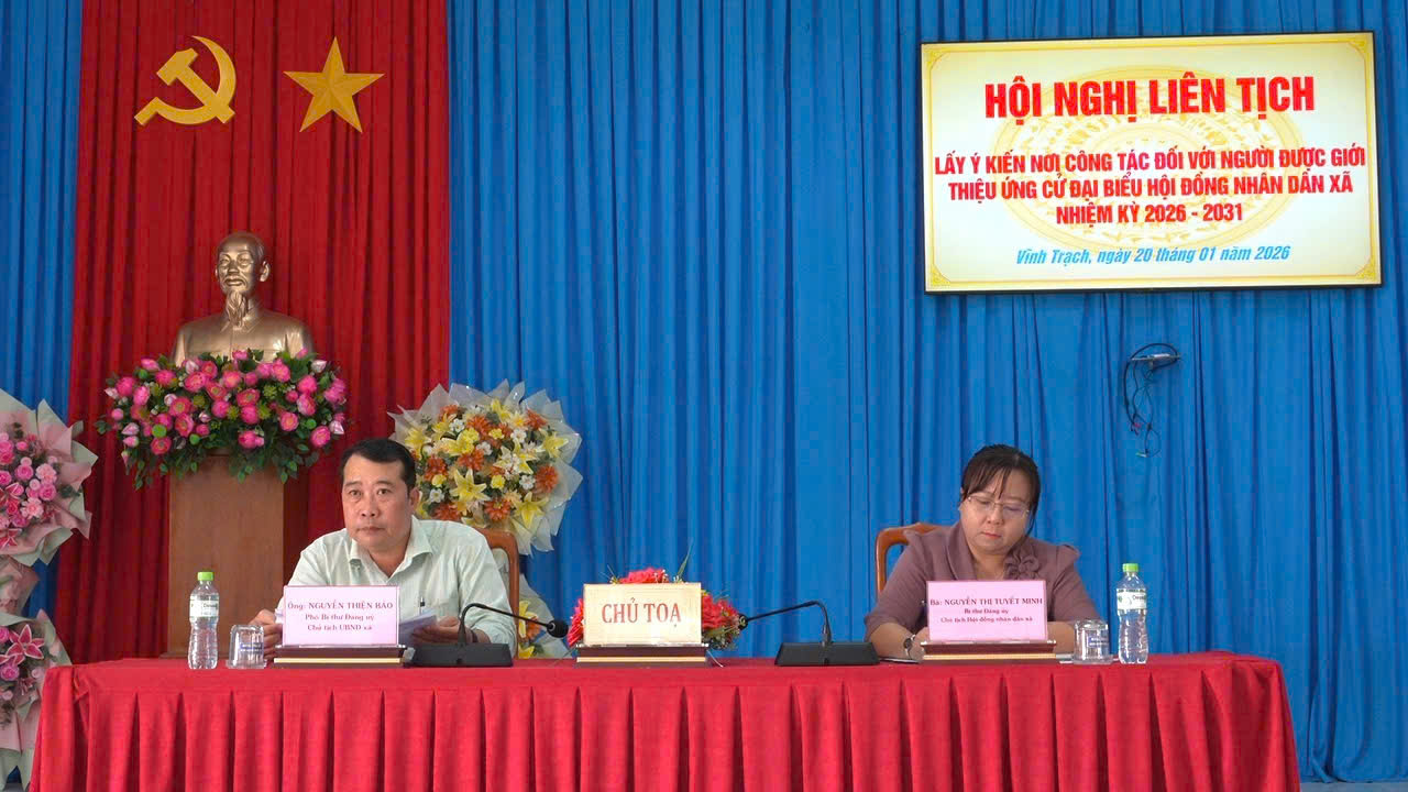Chiều ngày 20/1/2026, Thường trực Đảng ủy xã Vĩnh Trạch tổ chức Hội nghị liên tịch giữa các cơ quan: Đảng ủy, Hội đồng nhân dân, Ủy ban nhân dân, Ủy ban Mặt trận Tổ quốc Việt Nam xã và các tổ chức chính trị – xã hội nhằm lấy ý kiến nhận xét của cử tri nơi công tác đối với người được dự kiến giới thiệu ứng cử đại biểu Hội đồng nhân dân xã, nhiệm kỳ 2026–2031. Hội nghị do đồng chí Nguyễn Thị Tuyết Minh - Bí thư Đảng ủy, Chủ tịch Hội đồng nhân dân xã, Trưởng Ban Chỉ đạo Bầu cử xã và đồng chí Nguyễn Thiện Bảo – Phó Bí thư Đảng ủy, Chủ tịch Ủy ban nhân dân xã, Chủ tịch Ủy ban Bầu cử xã đồng chủ tọa. Tham dự hội nghị có đồng chí Trần Thị Phong Lan – Phó Bí thư Thường trực Đảng ủy xã; các đồng chí Ủy viên Ban Thường vụ, Ban Chấp hành Đảng bộ xã cùng cán bộ, công chức, viên chức và người hoạt động không chuyên trách xã.