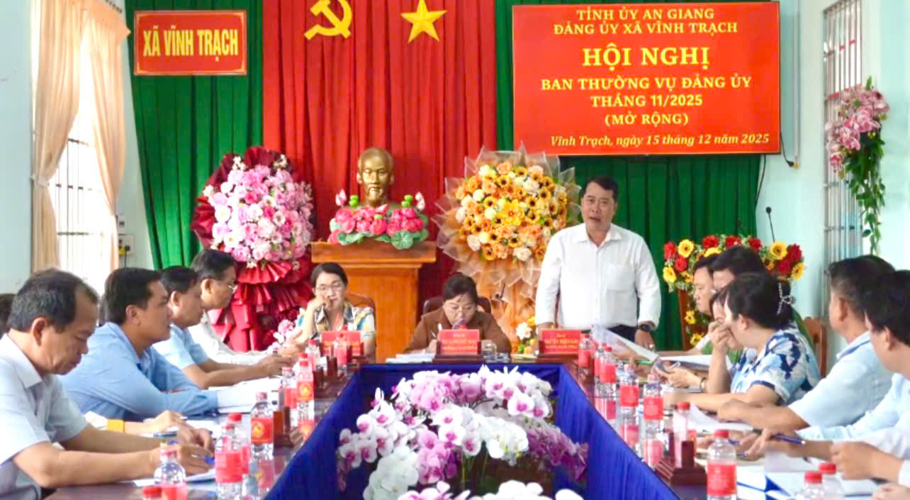 Đảng ủy xã Vĩnh Trạch vừa tổ chức Hội nghị Ban Thường vụ Đảng ủy tháng 11 năm 2025 (mở rộng). Đồng chí Nguyễn Thị Tuyết Minh – Bí thư Đảng ủy, Chủ tịch Hội đồng nhân dân xã Vĩnh Trạch chủ trì Hội nghị. Tham dự Hội nghị có đồng chí Trần Thị Phong Lan – Phó Bí thư Thường Trực Đảng ủy xã; đồng chí Nguyễn Thiện Bảo – Phó Bí thư Đảng ủy, Chủ tịch Ủy ban nhân dân xã cùng các đồng chí Ủy viên Ban Thường vụ, Ủy viên Ban chấp hành và lãnh đạo các phòng, ban ngành xã.